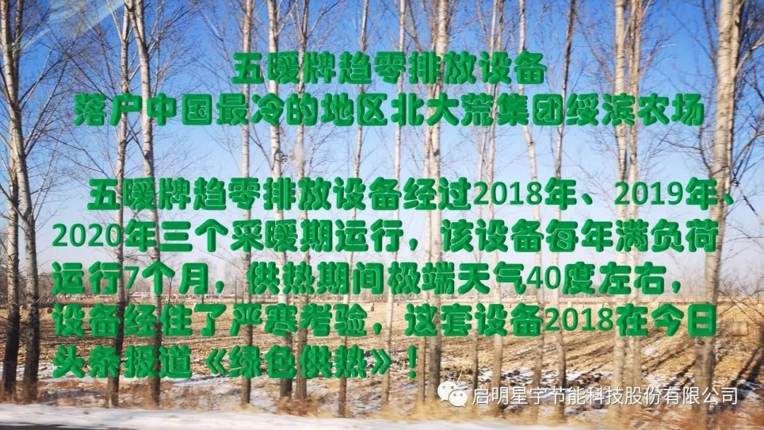 五暖牌趨零排放設備經過2018年、2019年、2020年三個采暖期運行,該設備每年滿負荷運行7個月,供熱期間極端天氣40度左右,設備經住了嚴寒考驗,這套設備2018在今日頭條報道《綠色供熱》!