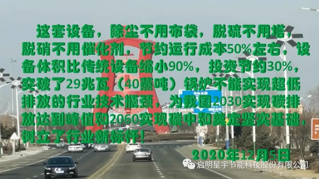 這套設備,除塵不用布袋,脫硫不用塔,脫硝不用催化劑,節約運行成本50%左右,設備體積比傳統設備縮小90%,投資節約30%,突破了29兆瓦(40蒸噸)鍋爐不能實現超低排放的行業技術瓶頸,為我國2030實現碳排放達到峰值和2060實現碳中和奠定堅實基礎,樹立了行業新標桿!