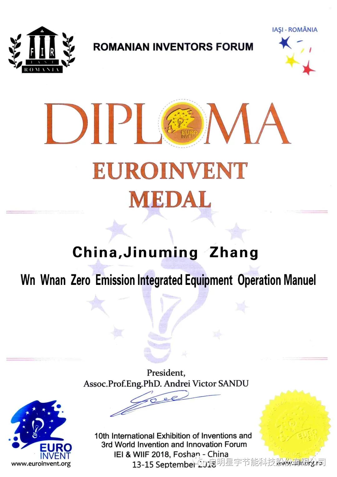 2018年9月參加第十屆國際發明博覽會,獲得發明創業獎,金獎、銀獎、銅獎;獲得歐洲發明協會環境治理發明金獎;獲得《發明之星》。
