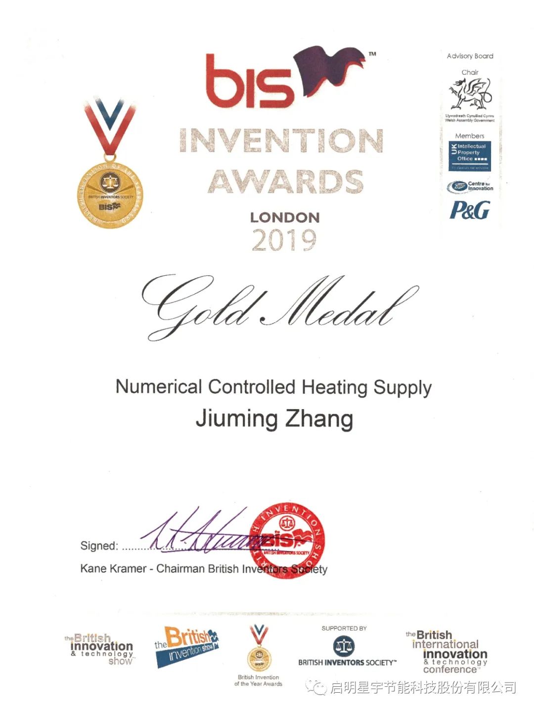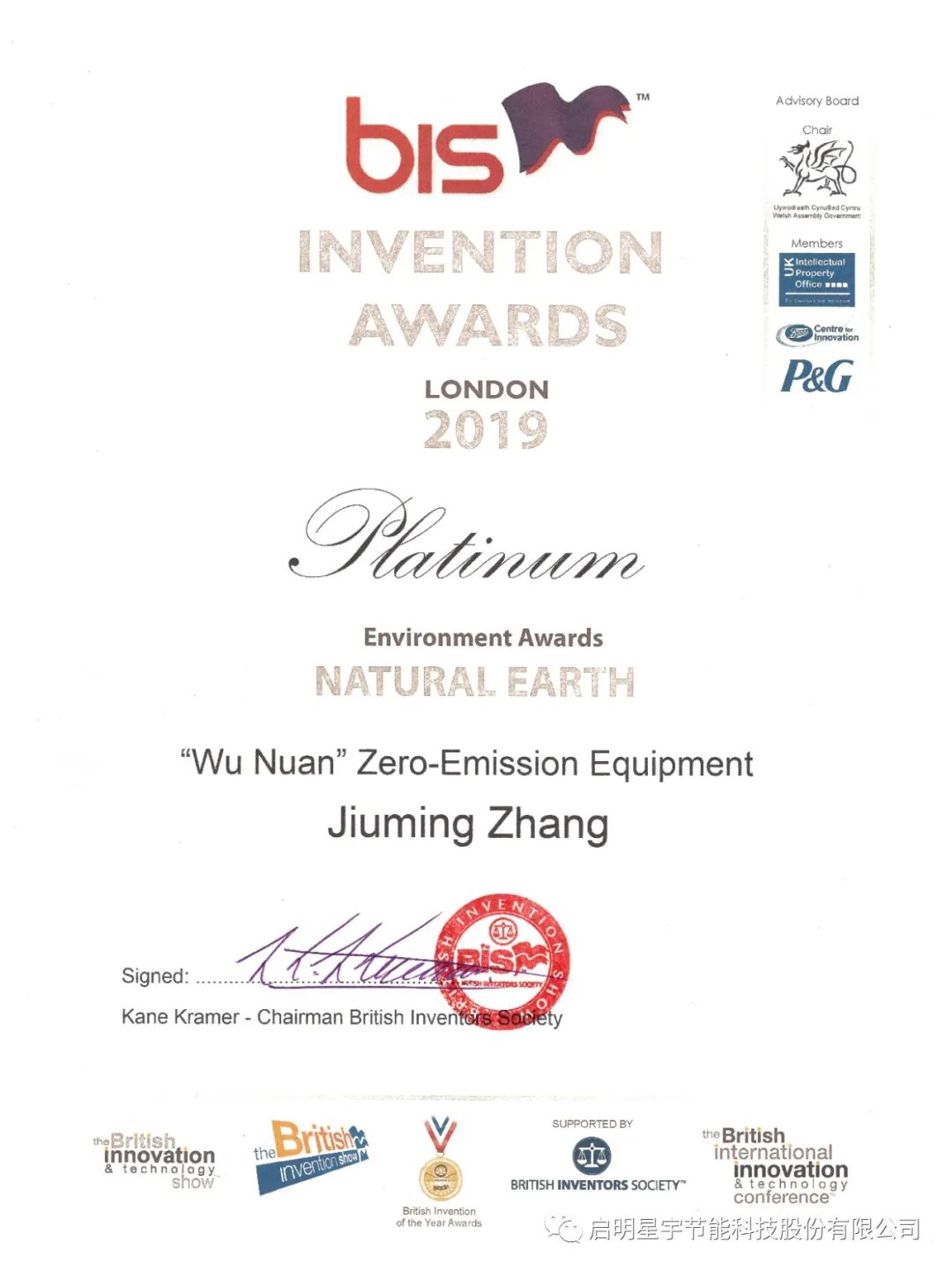 2019年10月參加英國19屆國際發明博覽會,獲得全球環境技術最高獎---鉑金獎,同時獲得雙金獎!三金入庫的可喜成績!