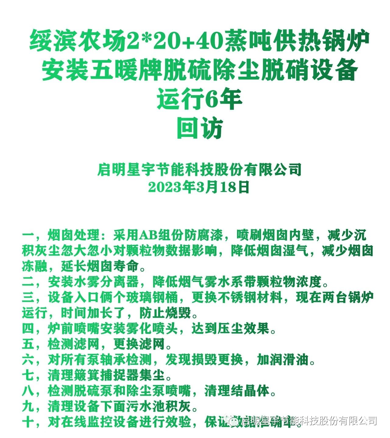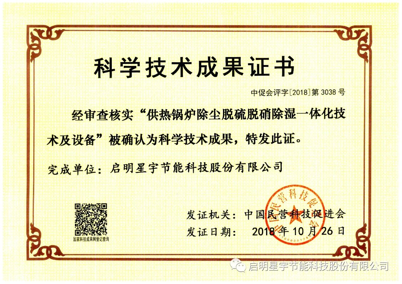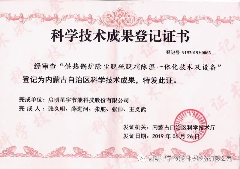啟明星宇節能科技股份有限公司于2018年在綏濱農場,安裝3臺五暖牌脫硫除塵脫硝設備,安全運行6個采暖期,這套設備除塵不用更換布袋,脫硫不用脫硫塔,脫硝不用催化劑。